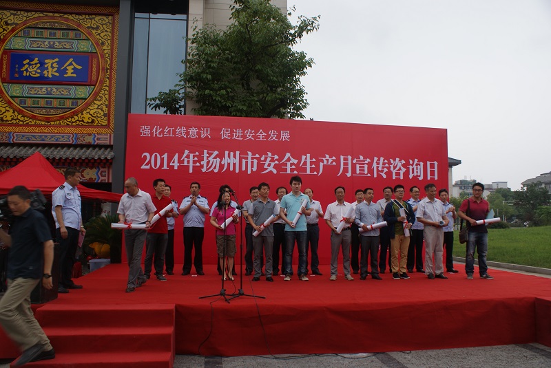 6月16日上午,揚(yáng)州市安委辦會(huì)同蜀崗—瘦西湖風(fēng)景名勝區(qū)管委會(huì)在虹橋坊舉行了以“強(qiáng)化紅線意識(shí),促進(jìn)安全發(fā)展”為主題的2014年揚(yáng)州市“安全生產(chǎn)月”宣傳咨詢(xún)?nèi)栈顒?dòng)。市安委會(huì)、市安監(jiān)局、蜀岡—瘦西湖風(fēng)景名勝區(qū)管委會(huì)、市人保公司負(fù)責(zé)人出席了活動(dòng)。市安監(jiān)局、揚(yáng)汽集團(tuán)、市城建控股集團(tuán)、市工藝美術(shù)集團(tuán)、金茂化工集團(tuán)、揚(yáng)子江集團(tuán)、建工控股集團(tuán)等11家單位以及消防、建筑、燃?xì)、氣象、質(zhì)監(jiān)、部分駐揚(yáng)單位的職工代表共計(jì)400余人參加了活動(dòng)。