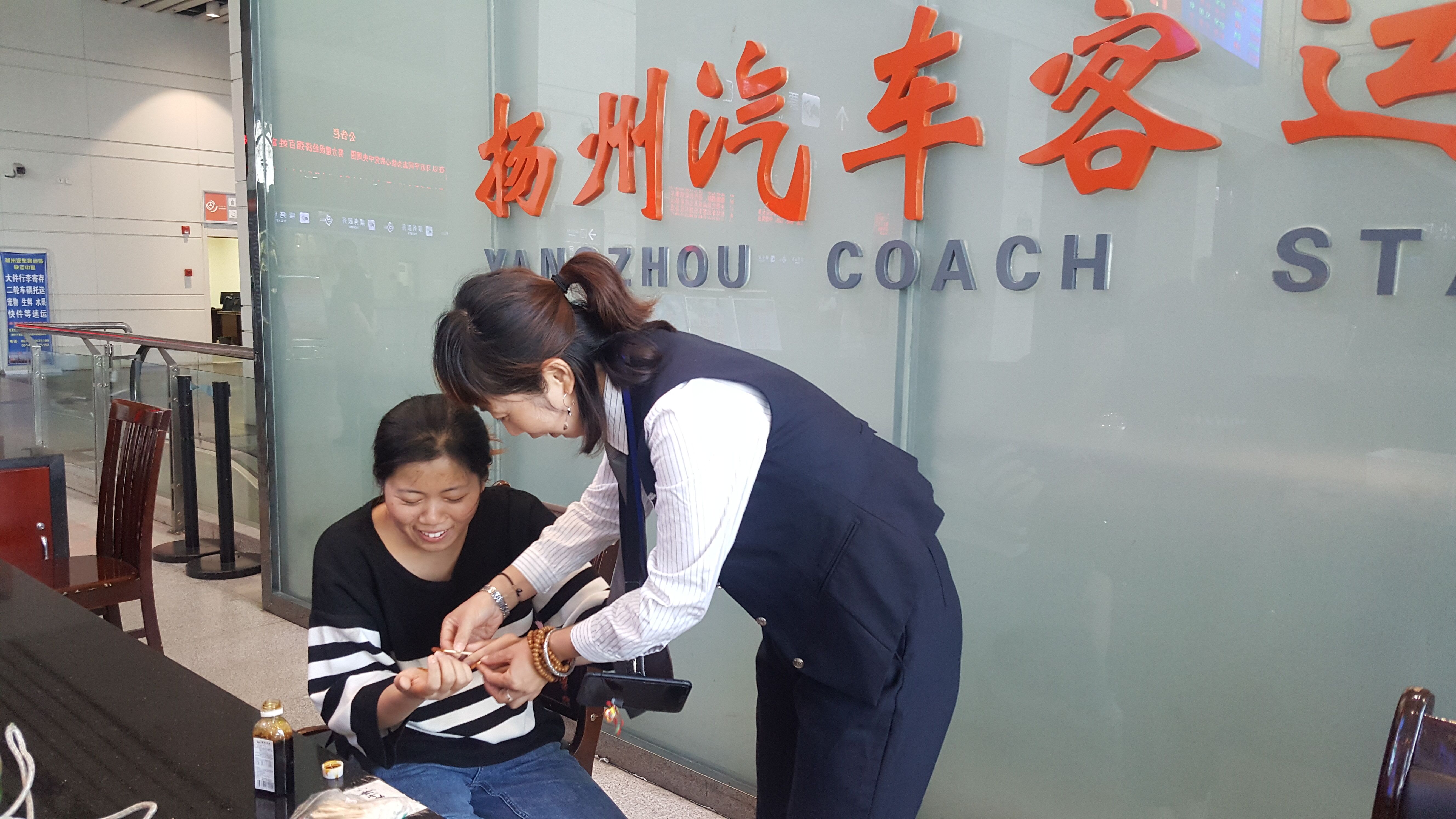 今天(10月11日)下午3時(shí)許,揚(yáng)州西部客運(yùn)樞紐售票大廳門(mén)口,一位年輕女子背著行李,一瘸一拐痛苦地邁進(jìn)了汽車(chē)站售票大廳,見(jiàn)此情形,眼尖心細(xì)的服務(wù)班工作人員殷俊,迅速跑上前去,攙扶著該女士坐下。