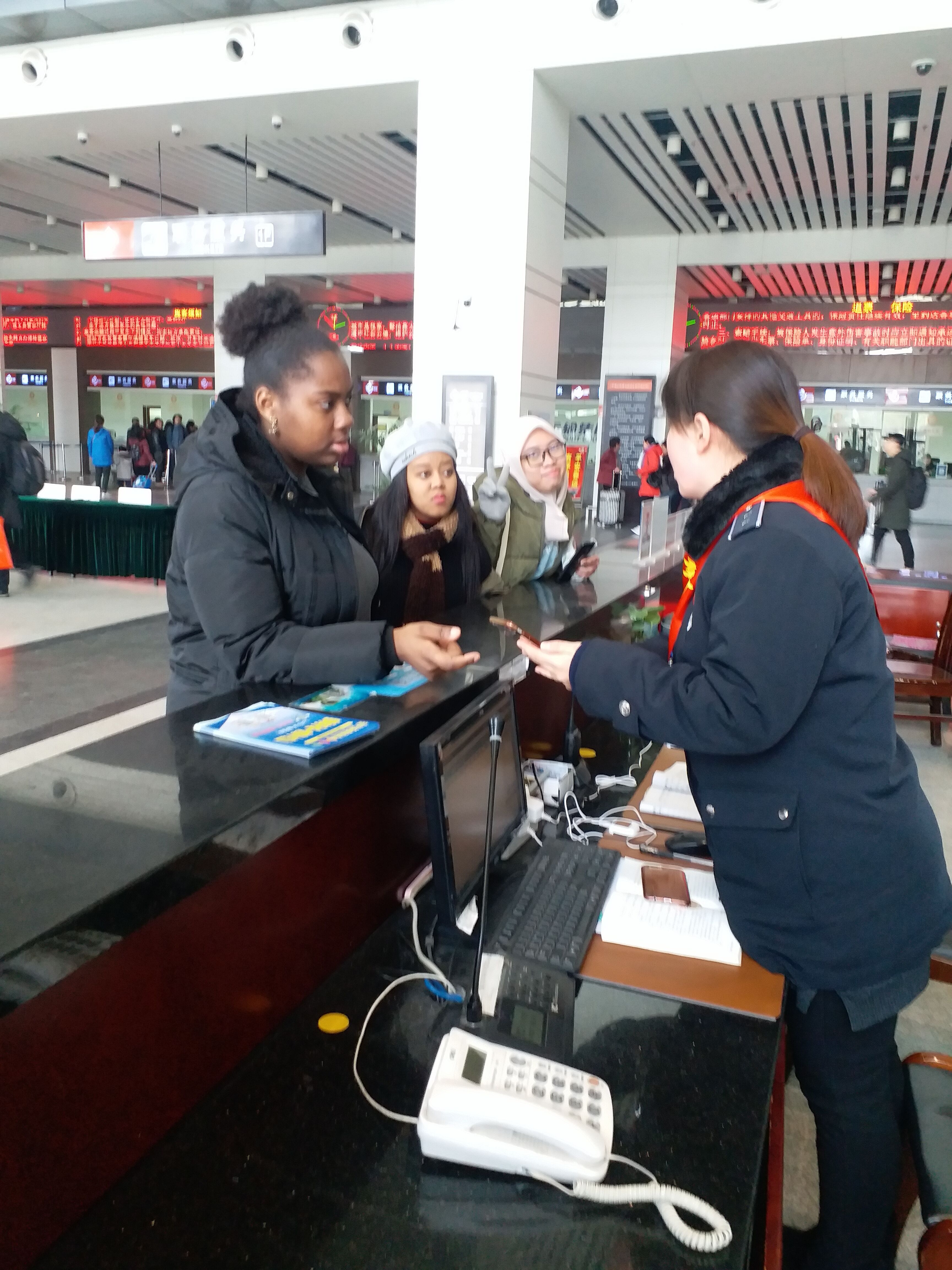 下午12時(shí)30分左右,來(lái)自揚(yáng)大的南非和印尼的三位女留學(xué)生,來(lái)到車站,想乘車去南通與同鄉(xiāng)會(huì)面,到了車站后,才發(fā)現(xiàn)去南通需要到揚(yáng)州汽車東站乘車,而且班次的時(shí)間在兩點(diǎn),一時(shí)性急的三位留學(xué)生沒(méi)了主意,操著生硬的中文,來(lái)到服務(wù)臺(tái)求助。服務(wù)臺(tái)工作人員尹海霞熱情地幫助她們查詢了發(fā)往南通的大巴班次,立即為她們購(gòu)買了已經(jīng)為數(shù)不多的車票?紤]到時(shí)間比較緊,尹海霞又將她們帶到公交上客區(qū),送她們上車,趕往東站。印尼的留學(xué)生上車時(shí)豎著大拇指說(shuō)道:“車站漂亮,人更漂亮!”