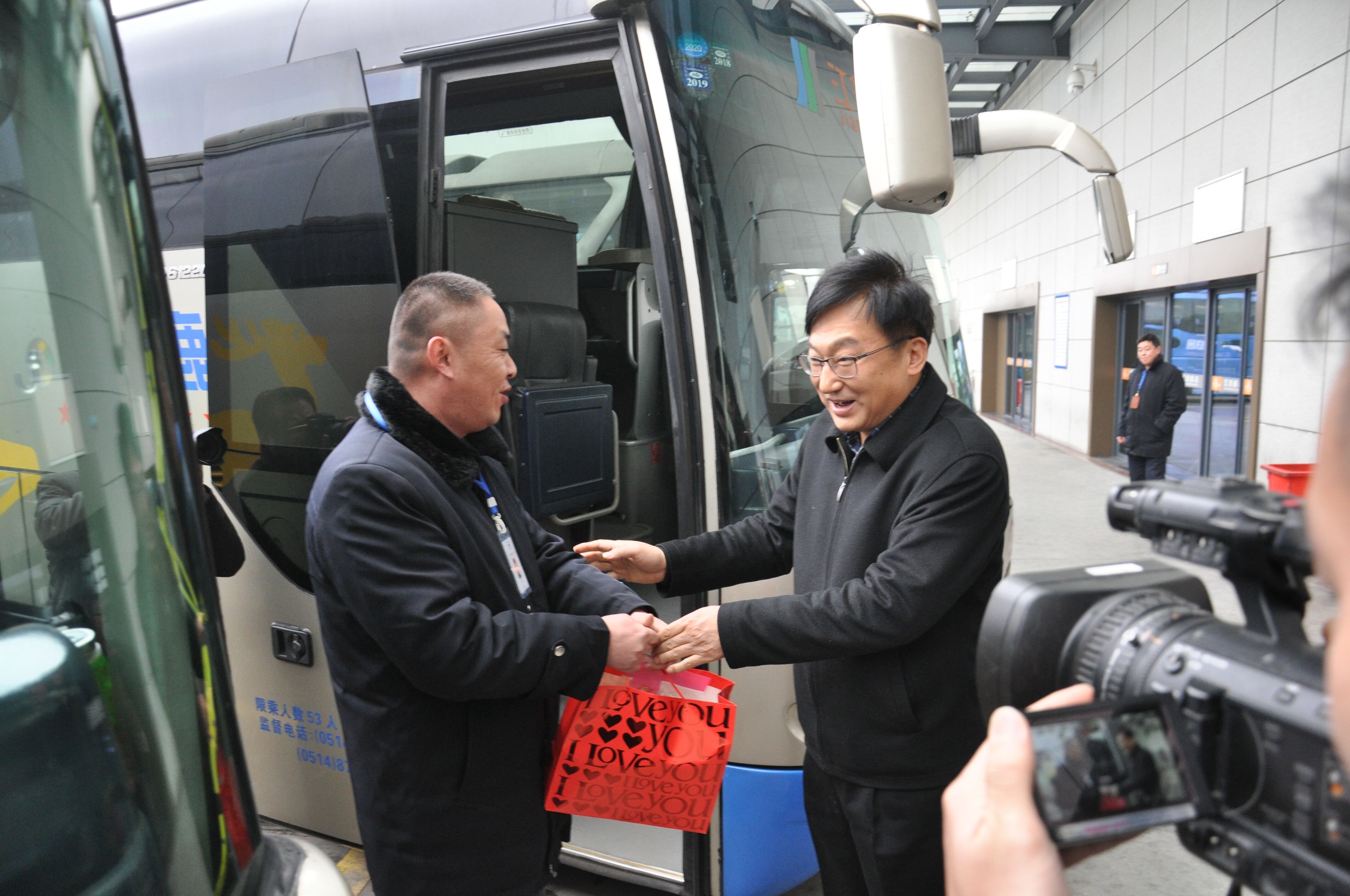 會(huì)議結(jié)束后,丁市長一行前往公交和揚(yáng)汽的場(chǎng)站,對(duì)一線駕駛服務(wù)人員進(jìn)行慰問。丁市長還登上揚(yáng)汽的大巴車,給旅客送上了象征吉祥如意的桔子,祝福大家一路平安,闔家幸福。
