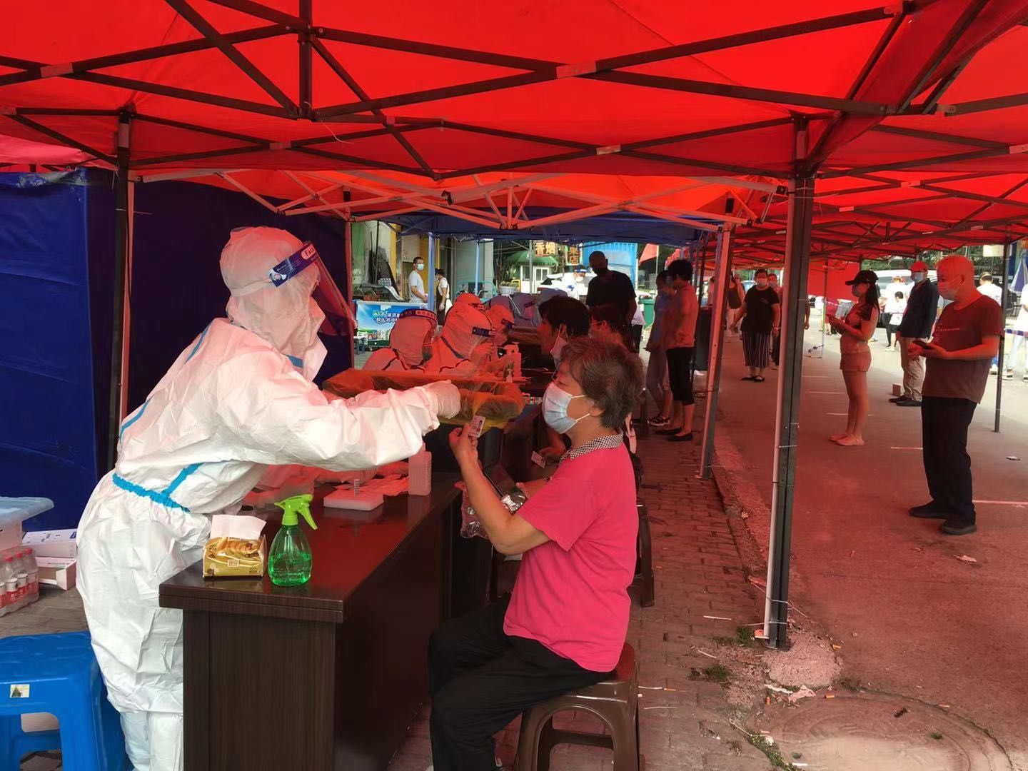 隨著時間的推延,戶外炎熱難耐,不是親身經(jīng)歷,真難以想象沖在第一線的醫(yī)護(hù)人員是怎么熬過來的。為時近幾個小時的這段艱難時光中,我好幾次覺得自己快缺氧窒息了,不過看著其他志愿者送來的降溫冰塊,給我們?nèi)韲姙⒕凭禍兀l又何嘗不是負(fù)重前行呢?在一次次鼓勵加油中,終于完成了上午的核酸檢測任務(wù),當(dāng)我脫下防護(hù)服后,衣服可以擠出水來,雙手被汗?jié)n泡的發(fā)白。同時,排隊做核酸的居民也很辛苦,個個汗流浹背,他們聽從指揮,秩序井然,有的向我們問候,“你們也辛苦了!”,心里很是感動。
