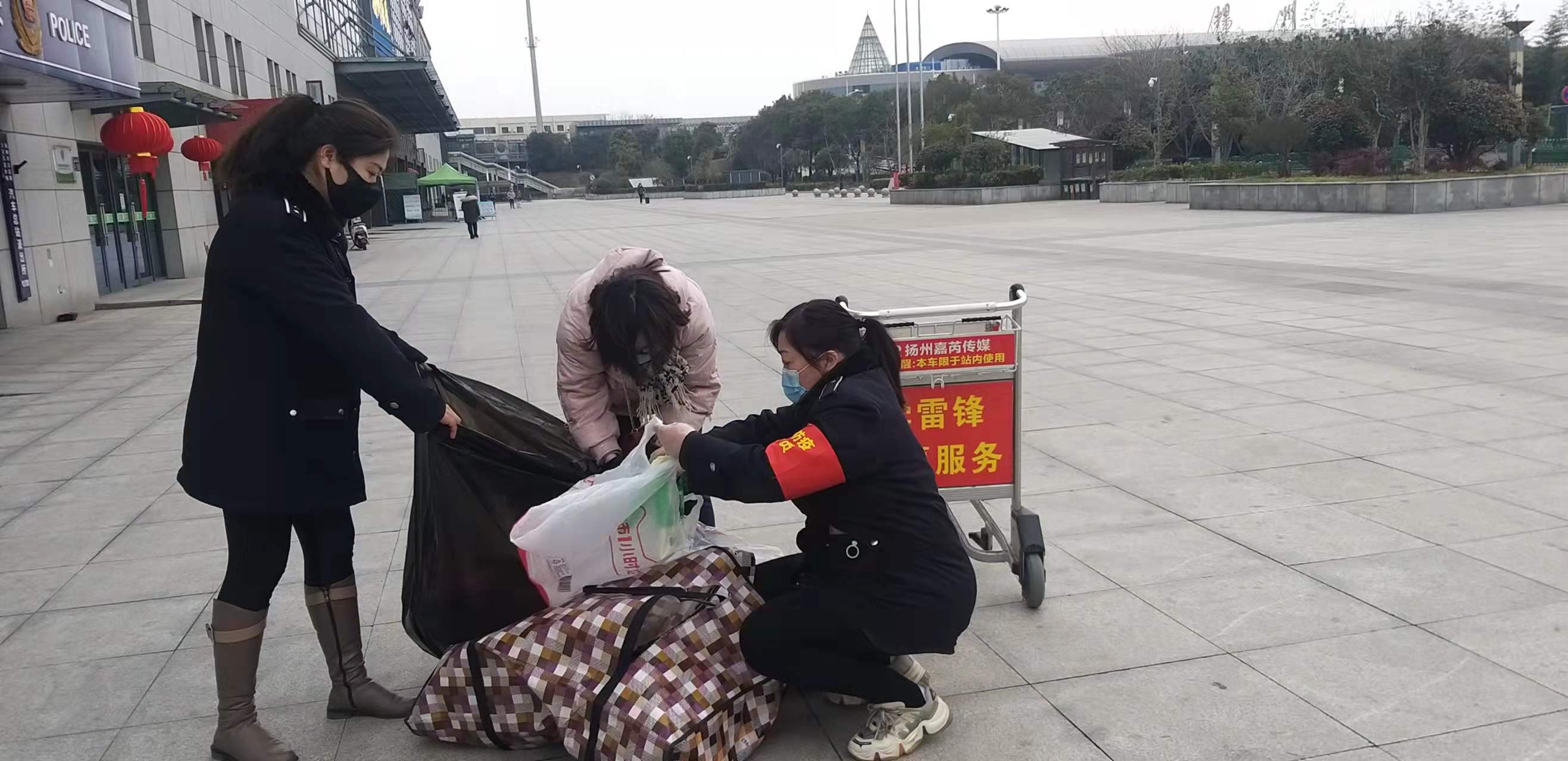 1月29日下午4點(diǎn)時(shí)分,西部客運(yùn)樞紐揚(yáng)州汽車站務(wù)中心工作人員殷丹和薛揚(yáng),日常工作巡查時(shí),在站前廣場進(jìn)口處,看到一名旅客蹲在地上,手里抱著散落一地的行李無計(jì)可施,焦急萬分。