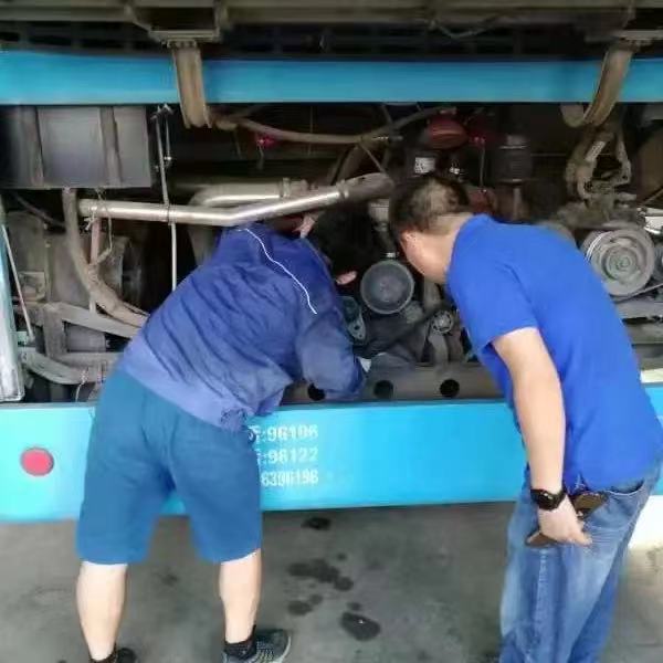 熱浪滾滾的場地上,已經(jīng)被汗水濕透了衣服的趙志明師傅,腳蹬保險杠,趴在熱烘烘的引擎上檢修,一邊還叮囑一旁等候的校車駕駛員相關(guān)注意事項。