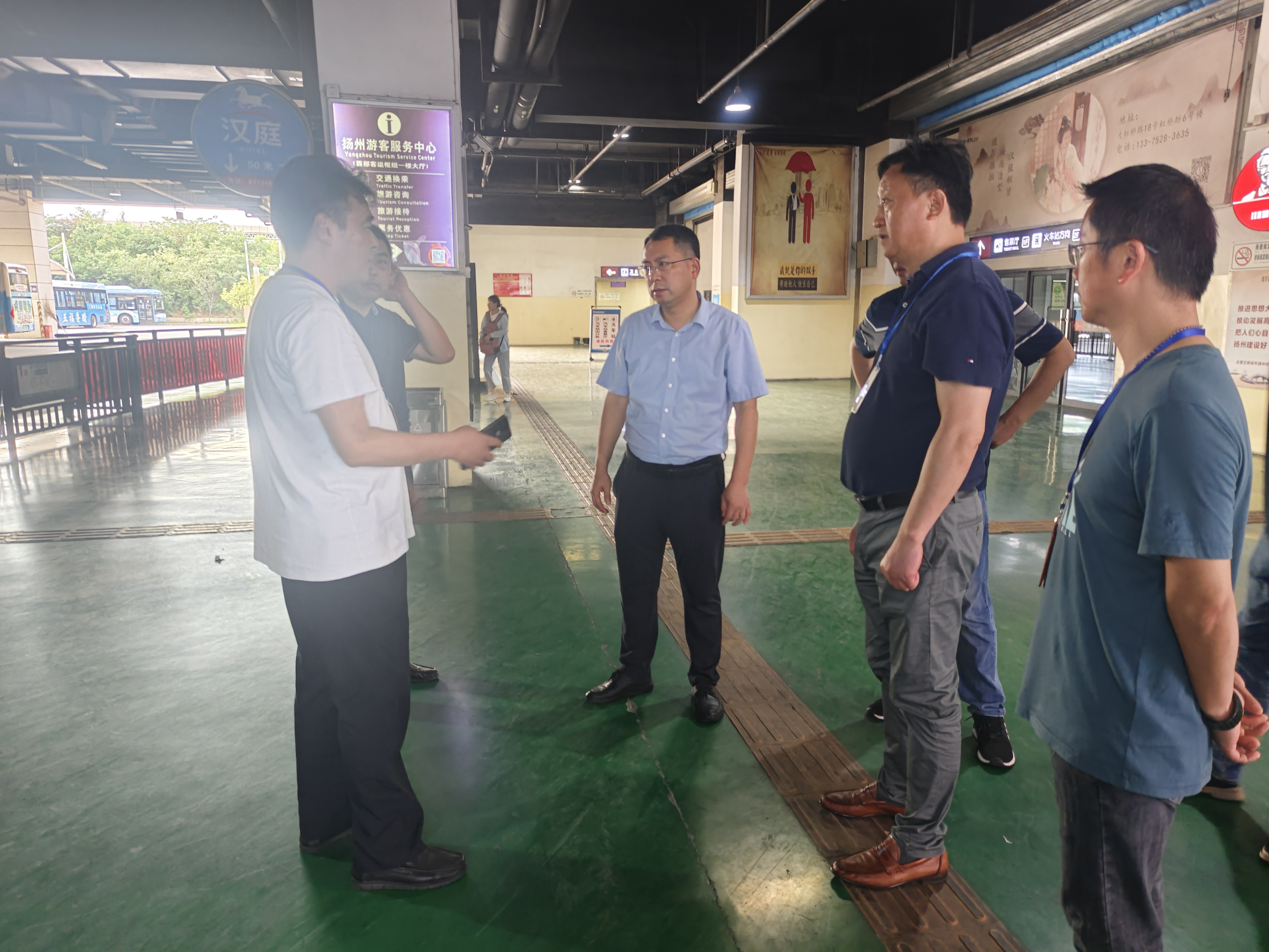 為落實好“安全生產(chǎn)月”活動要求,緊扣“人人講安全、個個會應(yīng)急”主題,近日,市交通產(chǎn)業(yè)集團副總經(jīng)理,揚汽集團黨委書記、董事長龔宇峰帶隊檢查揚州汽車站安全生產(chǎn)工作,集團副總經(jīng)理劉俊及相關(guān)部門負(fù)責(zé)人陪同檢查。