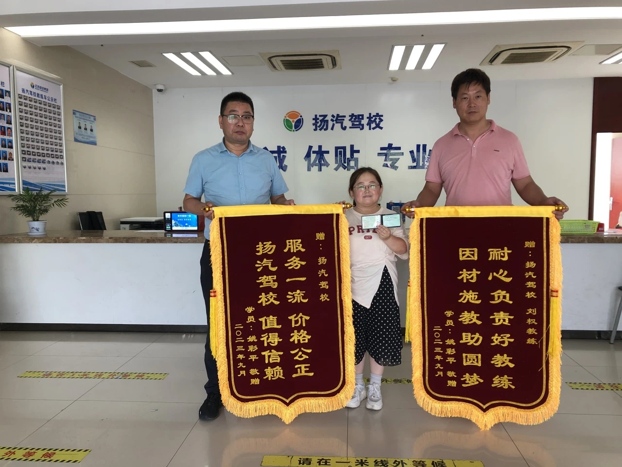 9月27日上午,在揚(yáng)汽駕校西部樞紐招生大廳內(nèi),昨天剛?cè)〉肅2駕照的學(xué)員姚彩平,將“服務(wù)一流、價格公正、揚(yáng)汽駕校、值得信賴”、“耐心負(fù)責(zé)好教練、因材施教助圓夢”兩面錦旗送到了揚(yáng)汽駕校主任顧軍和她的教練劉權(quán)的手上,感謝駕校工作人員和教練在她學(xué)車期間的認(rèn)真教學(xué)、辛苦付出。