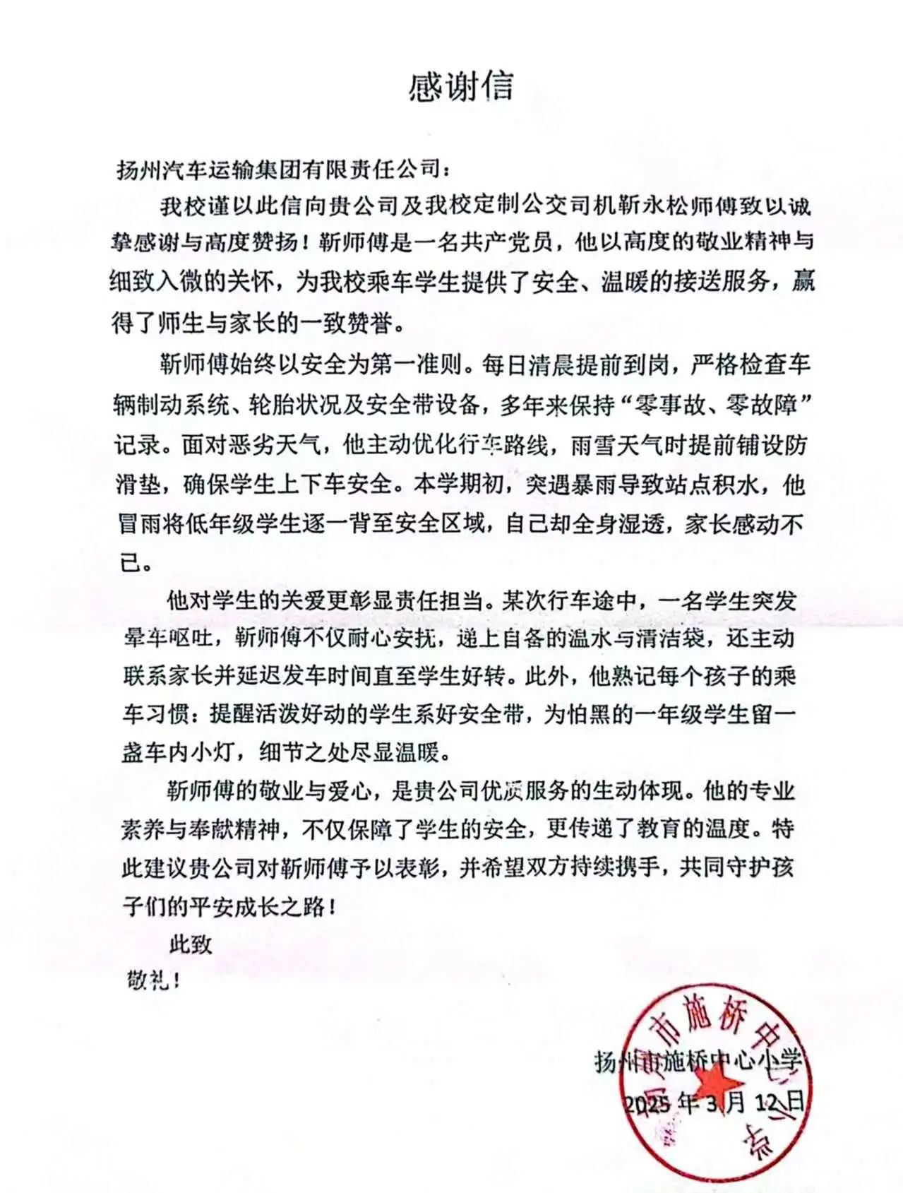 紙短情長(zhǎng) 愛(ài)有回響丨揚(yáng)汽集團(tuán)校車司機(jī)優(yōu)質(zhì)服務(wù)獲學(xué)校點(diǎn)贊