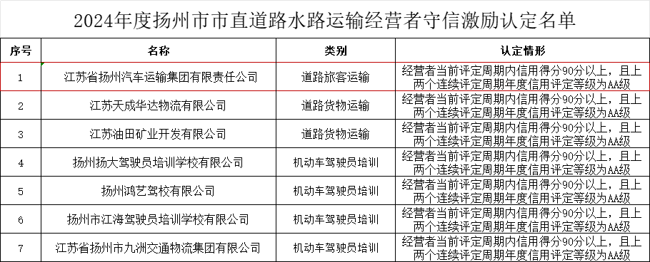 根據(jù)《江蘇省交通運(yùn)輸行業(yè)信用管理辦法》、《江蘇省道路水路運(yùn)輸經(jīng)營(yíng)者信用管理辦法》等文件要求,經(jīng)評(píng)審、公示等程序,近日,揚(yáng)州市交通運(yùn)輸局發(fā)布認(rèn)定公告,揚(yáng)汽集團(tuán)獲2024年度揚(yáng)州市市直道路運(yùn)輸經(jīng)營(yíng)者守信激勵(lì)名單認(rèn)定。