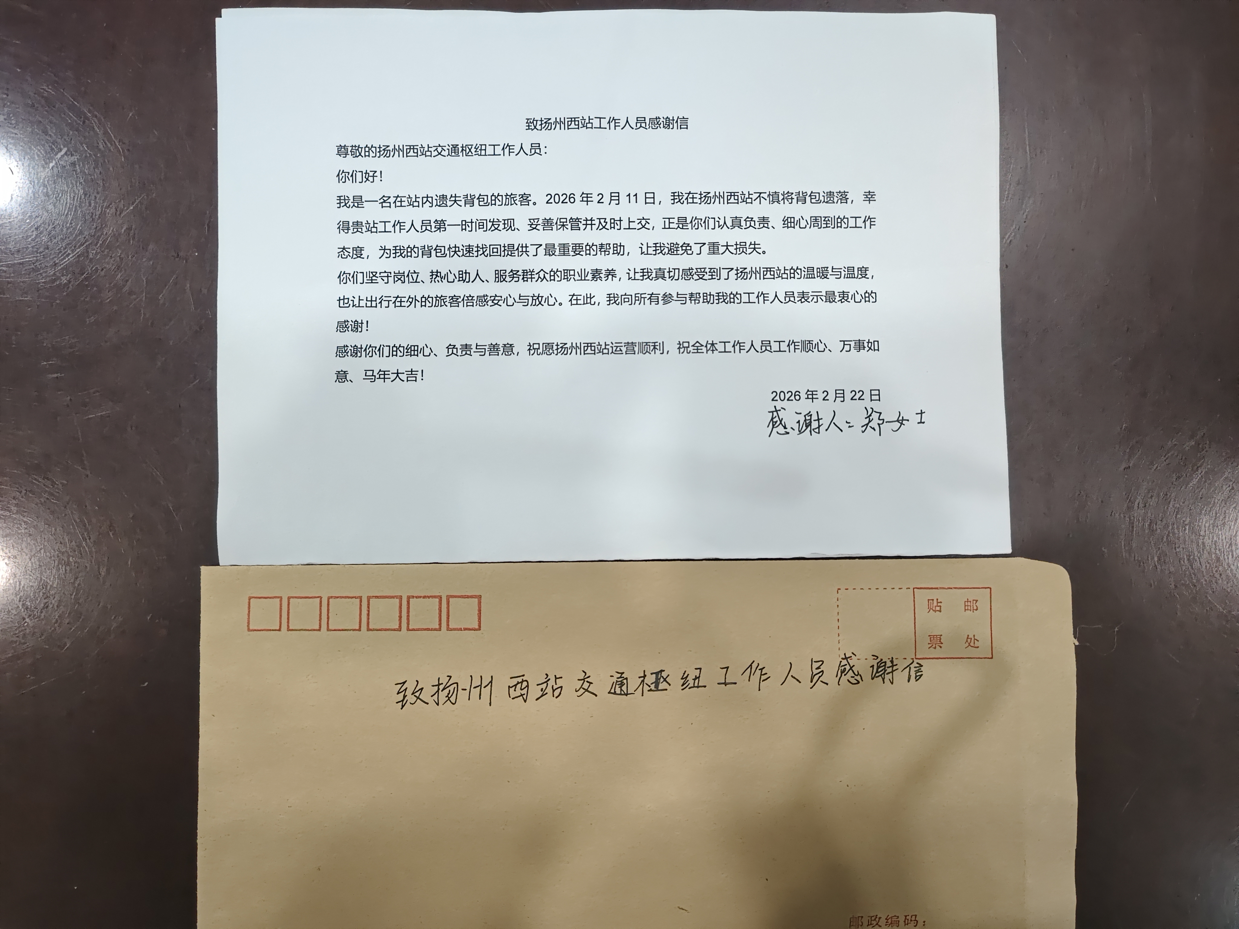 而這份“遲來”的感謝信,正是失主對揚(yáng)州站工作人員認(rèn)真負(fù)責(zé)態(tài)度的由衷肯定。信中寫道:“從發(fā)現(xiàn)失物到妥善保管、再到主動對接,每一個環(huán)節(jié)都體現(xiàn)出你們嚴(yán)謹(jǐn)細(xì)致、熱心助人的職業(yè)素養(yǎng)。正是因?yàn)橛心銈冞@樣堅(jiān)守崗位、默默付出的工作人員,才讓揚(yáng)州這座‘好地方’更溫暖、更安心。”